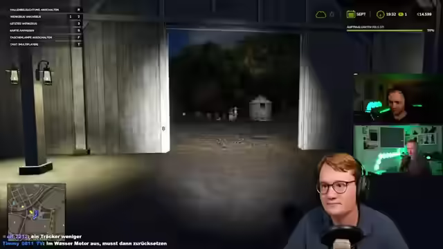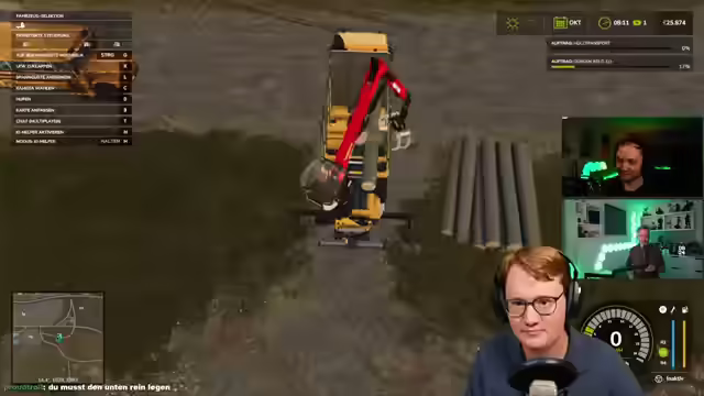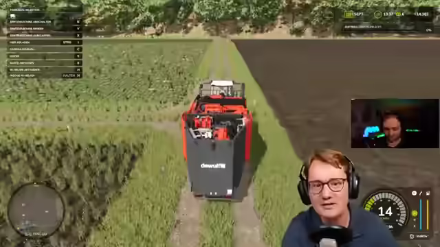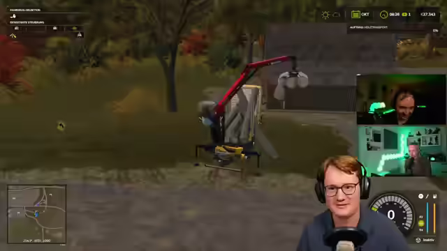 00:23:21Der Streamer startet einen Pastinaken-Sammelauftrag und bittet RGB Pixel um Hilfe. RGB Pixel soll mit einem zweiten Traktor beim Abtransport helfen. Der Streamer loggt sich als Admin ein, um die Zeitbeschleunigung einzustellen. Er fährt mit der Fähre, um zum Feld zu gelangen. Die Standardzeitbeschleunigung wird im Chat diskutiert. Der Streamer stellt die Zeitbeschleunigung auf sechsfache Geschwindigkeit ein und fragt, ob man im Spiel ins Wasser fallen kann. RGB Pixel soll mit dem Trecker kommen, um beim Abtransport zu helfen. Es wird über die Miete von Geräten diskutiert. RGB Pixel soll einen Anhänger an den Trecker hängen und die Fähre benutzen. Der Streamer fährt über eine Farm und erntet Pastinaken mit einer geliehenen Erntemaschine. RGB Pixel soll daneben herfahren, da die Erntemaschine keinen Tank hat. Der Streamer aktiviert die Spurführung und wartet auf RGB Pixel. RGB Pixel nimmt eine Abkürzung über das Feld eines anderen Bauern. Der Streamer startet den Erntevorgang und hat Schwierigkeiten mit der Maschine.