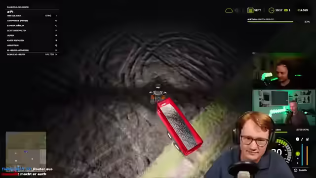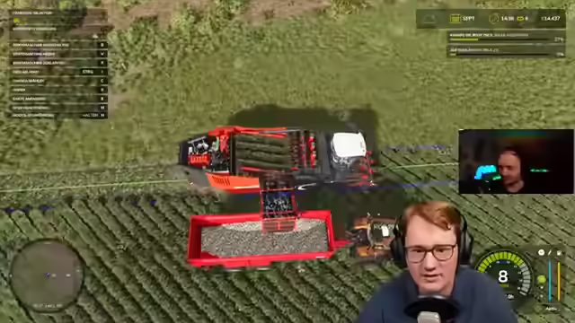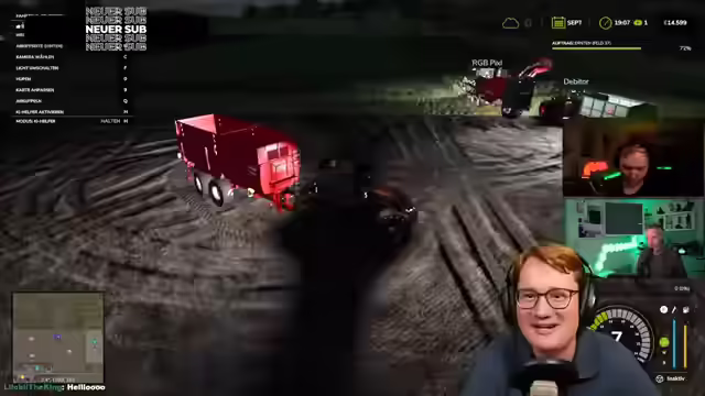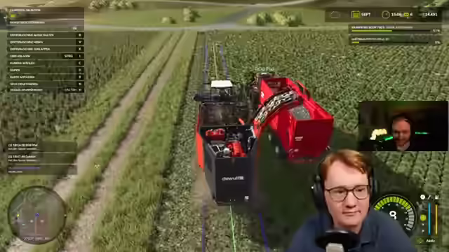 00:49:13Debitor fährt ohne Lenkrad und erzählt von seinen Erfahrungen mit Force Feedback und Lenkradheizung. Der Streamer fragt nach der Map. Es wird festgestellt, dass die Erntemaschine klein ist und der Aufwand für das Feld in keinem Verhältnis zum Ertrag steht. Der Auftrag wird als aufwendig und die Maschine als ungeeignet beschrieben. Debitor trifft ein und wird im Stream begrüßt. Es wird geklärt, wo die Ernte abgeliefert werden muss. Der Ablieferungsort ist am anderen Ende der Map. Debitor nimmt die Einladung an und gibt seine Kamera frei. Die Abgabeort ist komplett diagonal gegenüber von der gesamten Map. Der Streamer und RGB Pixel stellen fest, dass der Auftrag mies ist. Es gibt kein Navi im Spiel. Debitor ist jetzt auch mit dabei und hilft mit seinem kleinen Anhänger. RGB Pixel ist auf dem Weg zum Abgabeort. Der Streamer und Debitor beginnen mit der Ernte. Der kleine Anhänger füllt sich schnell. RGB Pixel ist noch weit entfernt.