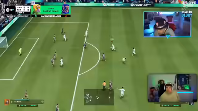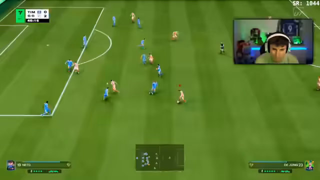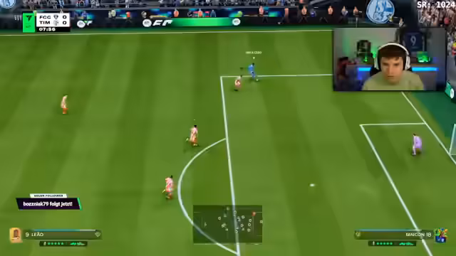 00:19:32Tim startet das erste Match gegen einen E-Sportler (E-AFC-Itachi-Flow). Nach einer unentschiedenen ersten Halbzeit (1:1) nutzt er die Pause für Motivation des Stürmers Pirani. In der zweiten Hälfte erzielt Pirani mit einem Weitschuss das 2:1, gefolgt vom 3:1 durch Leuchter. Tim feiert die Evo-Leistung ('illegal gut'), kritisiert aber gleichzeitig die schwierige Verteidigung gegen kreative Kickoff-Taktiken des Gegners.