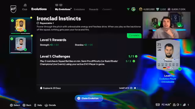 Der Spieler erklärt eine Planänderung für seinen freien Tag, da viele Evos ablaufen. Er muss rund 20 Spiele absolvieren und konzentriert sich auf die Verbesserung von Armin Younes und Scylla. Dabei geht es um Playstyles und die Vorbereitung auf das Öffnen zahlreicher Packs aus Gauntlets und Cups. Er plant, in der Primetime-Liga Golden Goal zu spielen, um die Spiele effizienter abzuschließen.