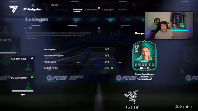 00:03:22Der Streamer begrüßt die Zuschauer zu seinem freien Tag und erklärt eine Planänderung: Heute laufen viele Evos aus, und er muss noch etwa 20 Spiele absolvieren. Daher hat er sich entschieden, den Stream zu starten. Sein Hauptziel ist es, eine „richtig gute Evo“ für Armin Younes zu machen, der am Ende 5 Sterne Skill und 5 Sterne Weak Foot haben soll, mit Dreieck, Flachschuss und Finesse. Dafür sind drei Durchläufe der Ausdauer-Evo nötig. Nebenbei arbeitet er auch an Scylla, dem er den „Gamechanger Plus“-Playstyle in Gold gegeben hat, da dieser seiner Meinung nach stark unterschätzt wird und ihm zusätzlich Tiki-Taka als Playstyle freischaltet. Er betont, dass Playstyles dieses Jahr wichtiger sind als reine Stats. Zusätzlich müssen noch die SPCs für Salazar und die „Undead Lion“-Evo abgeschlossen werden, bevor „Spooky Striker“ gestartet werden kann, was insgesamt 19 Matches erfordert.