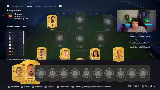 00:31:48Der Streamer hat die Scylla Evo fertiggestellt und überlegt, ob er sie in die World Tour reinstecken soll. Er erklärt die Vorteile der World Tour und Cornerstone Evos: World Tour gibt einen doppelten Nationen-Link und Cornerstone einen doppelten Vereins-Link. Dies ist besonders wichtig für die Chemie des Teams, da man sich so für 35.000 Coins mehr Chemie erkaufen kann. Er demonstriert dies an seinem Team, wo Karius als Cornerstone-Karte doppelt für die Schalke-Chemie zählt und Scylla doppelt für die Mali-Chemie. Er muss noch fünf weitere Spiele für die „Eiserne Instinkte“-Evo absolvieren, um Younes mehr Ausdauer und Stärke zu verleihen, da dies für die Karte wichtig ist und sonst nicht mehr zu bekommen wäre. Er sucht weiterhin nach einem letzten Golden Goal Gegner in der Primetime-Liga, um diesen Schritt abzuschließen.