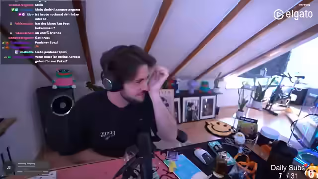 00:09:53Die Teilnehmer spielen das Zeichenspiel 'Crawling from Memory', bei dem sie verschiedene Begriffe wie Fantasy-Charaktere und Tiere zeichnen müssen. Es kommt zu diversen technischen Problemen mit der Stream-Software und Hardware, darunter ein defektes Stream Deck und Soundprobleme. Der Streamer erwähnt auch den Erhalt eines Pakets von Elgato und plant, dieses später mit seinem Publikum auszupacken.