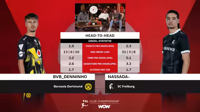 01:55:14Das Live-Übertragung beginnt mit dem Spiel zwischen dem 1. FC St. Pauli und dem SC Freiburg, einem Duell der beiden besten Einzelspieler der Saison, Nasada und Berghai. Freiburg geht durch eine starke Offensive früh in Führung, doch St. Pauli kämpft sich zurück und gleicht aus. Das Spiel entwickelt sich zu einem hochspannenden Torfestival, in dem Nasada mit mehreren Treffern überzeugt und letztlich einen klaren Sieg für Freiburg herausspielt. Die Leistung Nasadas als dominierender Spieler hebt dieses Match besonders hervor.