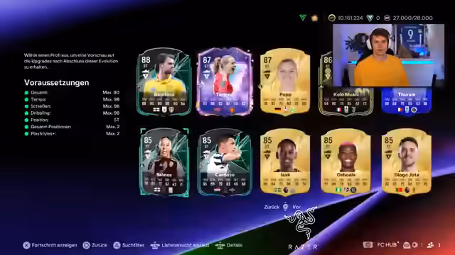 00:07:45Es wird über die Dream Chaser Promo diskutiert, die als die schlechteste Promo von allen bewertet wird. Der Streamer überlegt, welche Spieler er für sein Team auswählen soll, wobei er zwischen Bajoa und einem Lyon-Spieler schwankt und sich letztendlich für den Lyon-Spieler entscheidet. Es werden Fantasy Upgrades erwähnt und der Verein nach möglichen Upgrades für Spieler wie Jule Brand und Hazard durchsucht. Es wird festgestellt, dass sich kaum ein Spieler im Team verbessert hat, außer Mahlen. Der Streamer lädt Luca ein, um ihm bei den Karaman-Spielen zu helfen, und spricht über Rush-Spiele mit der Community. Gerüchte über Kevin De Bruynes möglichen Wechsel von Manchester City werden diskutiert. Der Streamer benötigt Vorlagen mit Sané und Toren mit deutschen Spielern, um Aufgaben zu erfüllen. Die Frage, wo man MLS in Deutschland schauen kann, wird aufgeworfen und diskutiert. Es wird überlegt, ob es bei DAZN für jedes Spiel einen deutschen Kommentator gibt.