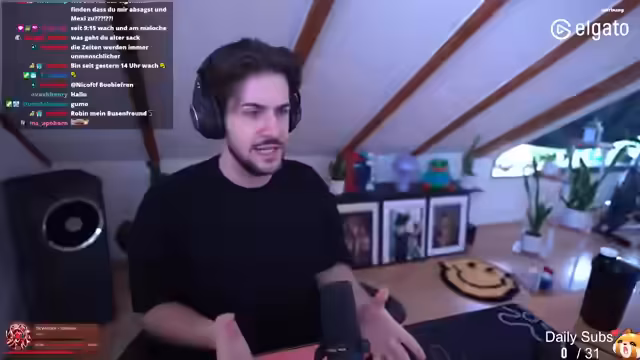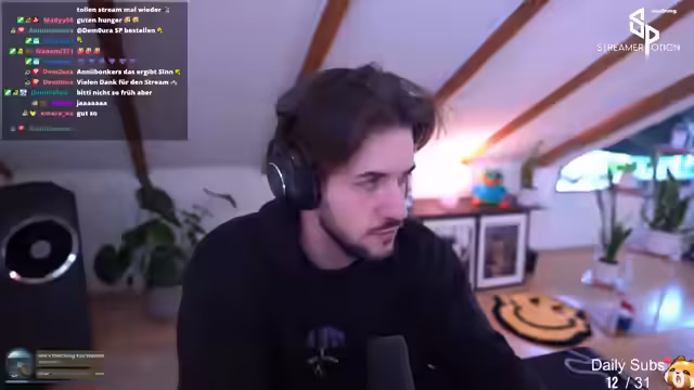 00:03:00Der Stream beginnt mit einem neuen Hintergrund, der verschiedene Anime-Charaktere wie Chainsaw Man, Jujutsu Kaisen und Attack on Titan sowie persönliche Gegenstände wie eine Pilzlampe und einen Among Us-Charakter zeigt. Der Streamer erwähnt, dass er früh aufgestanden ist und bis 3:30 Uhr wach war, nur 5 Stunden Schlaf bekam. Er plant, nur bis 14 Uhr zu streamen, da um 15 Uhr eine Videodreh in Köln ansteht.