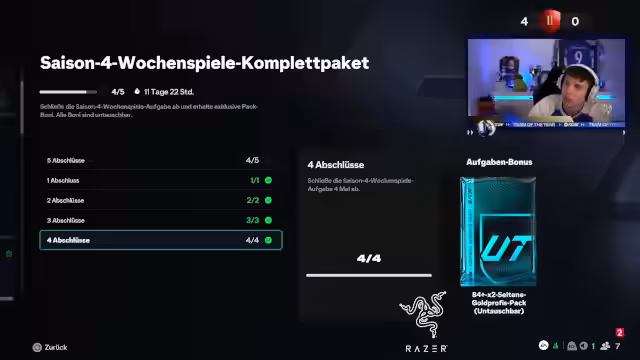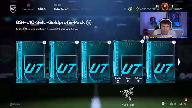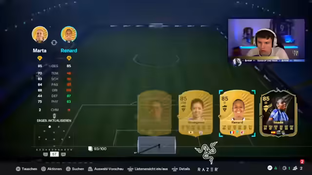 00:00:13Nachdem der Stream gestartet wurde, begrüßt der Streamer die Community und kündigt den Stream zur Team-of-the-Year-Promotion an. Er berichtet über seinen gestrigen Erwerb der Claudia-Pina-Karte für 145 Euro, die er ursprünglich zu einem als gut empfundenen Preis von 1,25 Euro erworben hat. Um die notwendigen 15-0-Belohnungen zu erreichen, beginnt er mit dem Zusammenspiel seiner Teams. Dabei stellt er fest, dass er einen 90er-Spieler benötigt und die SBCs für Lamin und Hullett erfolgreich abschließt, wobei er später die Pina-Karde zieht.