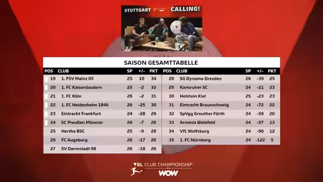 00:08:07Der Stream beginnt mit einer Begrüßung zum fünften Showdown der VBL Club Championship, der als letzte wichtige Station auf dem Weg zum Finale in Stuttgart dient. Gastgeber Tim Latka begrüßt seine langjährigen Gäste Mo und Richard und geht humorvoll auf Mys Outfit ein, der eine auffällige Dragonhose trägt. Die zentrale Analyse der anfänglichen Diskussion konzentriert sich auf die eng umkämpfte Tabelle, insbesondere den Kampf um die Top 8 Plätze. Die Moderator:innen bewerten die Chancen der fünf umkämpften Teams – VfB Stuttgart, Bayern, Leverkusen, Paderborn und Gladbach – und diskutieren auch die Situation im unteren Tabellendrittel, wo Teams wie Dresden und Augsburg noch auf die Top 24 hoffen können.