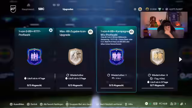 04:35:17Es gibt eine Strategie, den Triple Threat Cup bis 19 Uhr offen zu halten, falls eine V-Icon oder eine Evo veröffentlicht wird, die direkt in eine SBC eingebaut werden kann. Es werden verschiedene Pack-Typen wie gemischte Hero-Packs oder Road to the Final-Garantie-Packs diskutiert. Eine klare Linie im Teambau fehlt, da sich der Streamer zwischen verschiedenen SBCs und dem Fertigstellen des Rivals-Formats unsicher ist. Die Zeit für die Rivals-Spiele wird als knapp eingeschätzt.