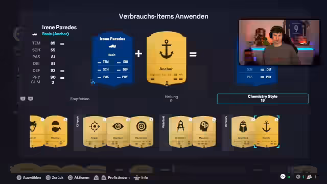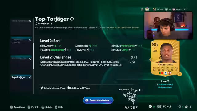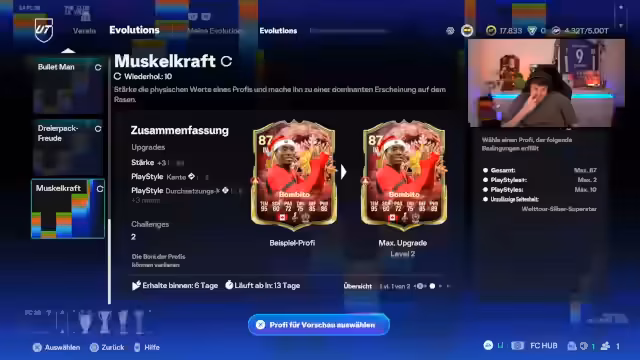 01:12:40Eine seltene Creative Director Evo wird entdeckt, die jedoch in neun Stunden abläuft, was für Zeitdruck sorgt. Die Vorteile und Nachteile dieser Karte werden abgewogen. Gleichzeitig treten vermehrt Münzprobleme auf, da der Streamer für diverse Aktionen wie SBCs und Evolutionen dringend Münzen benötigt und kritisiert deren Wertigkeit und die schlechte Verfügbarkeit.