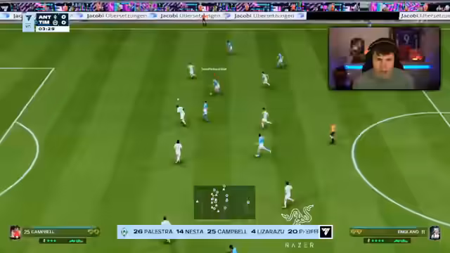 02:38:59Der Streamer analysiert intensiv das Spiel und kommentiert die Spielzüge und Entscheidungen. Er äußert sich frustriert über Standardsituationen und Tormöglichkeiten, die nicht genutzt wurden. Insbesondere kritisiert er die Defensive und vergleicht Spieler miteinander, wobei er auf deren Spielstil, Fähigkeiten und Aussehen eingeht. Auch das Gegenüber des Gegners wird häufig diskutiert und bewertet.