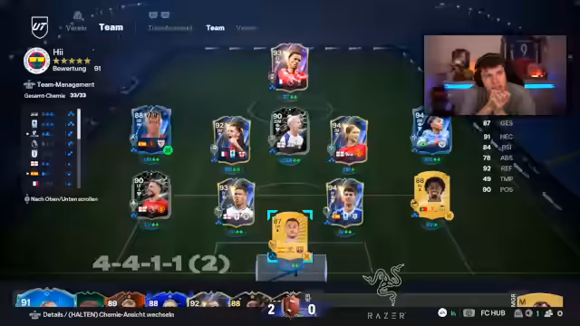 00:27:07Der Streamer beschreibt seine Strategien für Spiele, wie etwa den Aufbau von '15-0 Trupps' mit optimalen Playstyles. Er kritisiert Teams ohne technische Elemente und diskutiert die Bedeutung bestimmter Spielerattribute und Positionen. Dabei verrät seine Vorliebe für spezifische Karten wie Luna oder Rivaldo, die besondere Fertigkeiten wie 'Finesse' mitbringen und das Teamtaktisch bereichern.