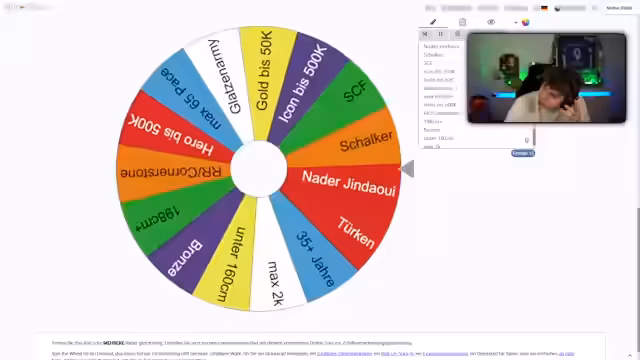 00:10:01Es wird eine Glücksrad-WL-Challenge wie bei Ely gestorgen vorgestellt. Das Prinzip: Ein Glücksrad entscheidet über das Squad. Pro Position wird gedreht, wobei ein festgelegter Starspieler ausgenommen wird. Kategorien wie Icons bis 500k, Goldkarten bis 50k, Glatzen-Spieler oder max. 65 Pace sind geplant. Ziel ist ein Mix aus guten und schlechten Spielern, um noch gute Ränge zu erreichen. Der Chat kann Kategorienvorschläge einbringen. Zusätzlich soll nach alle zwei Spielen ein Spieler ausgetauscht und neu gedreht werden, um das Team dynamisch zu halten.