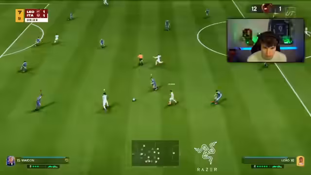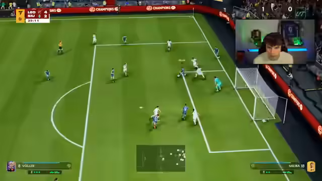 01:23:05Nach Pausen wird ein neues Spiel gestartet („5-2, jetzt warm“). Die Gegner-Mannschaft mit Saliba, Koundé und Haaland wird als stark eingeschätzt. Pina wird als aktuelle Meta-Karte („meistgespielte Karte“) und Grifo als entscheidender Passgeber („zu 15-0 geschossen“) hervorgehoben. Es folgt ein Ragequit des Gegners bei 1-0.