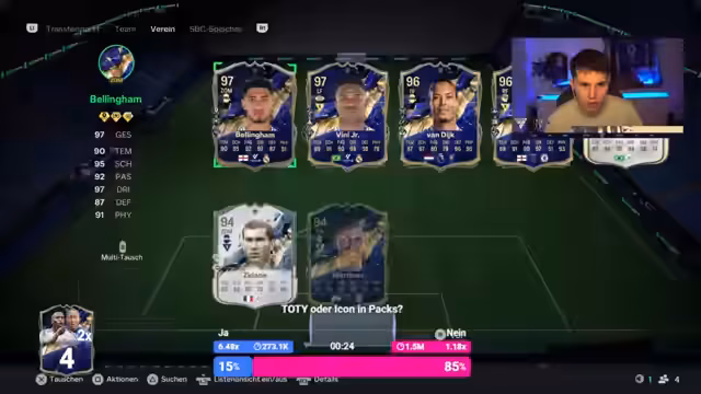 00:03:40Der Stream beginnt mit dem Öffnen von 20x82+ Packs. Der Streamer ist sehr zuversichtlich und rechnet mit einer geringen Chance von 0,6% für ein Team of the Year (TOTY), möchte aber mit 1,36 Millionen Coins und 55 Informs-Karten versuchen, dieses Ziel zu erreichen. Es wird geplant, mindestens 50 Packs zu öffnen. Zusätzlich muss noch eine Weekly Quali gespielt und eine Evo-Karte erstellt werden.