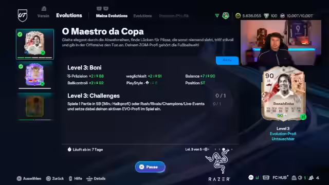 00:03:10Der Stream beginnt mit einer Begrüßung der Zuschauer. Der Fokus liegt auf der finalen Erstellung der Ronaldinho-Stürmer-Evolution, da der letzte Tag dafür bevorsteht. Der Streamer zeigt sich gespannt auf das Ergebnis und erwähnt, dass es sich gelohnt hat zu warten, da gestern noch ein weiterer Schuss-Bonus hinzukam. Nachdem er kurz seine aktuellen XP-Möglichkeiten im Spiel betrachtet, beginnt er mit dem Öffnen von Packs, um Startmaterial für die Evolution zu sammeln. Anschließend kündigt er an, zuerst eine Runde Rivals zu spielen, um den Spieler zu testen.