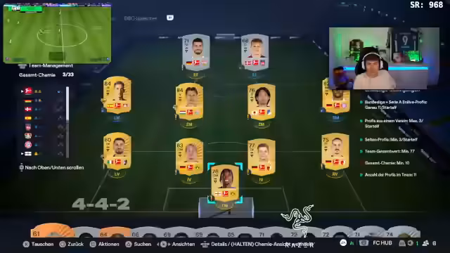 00:06:38Der Streamer widmet sich dem Aufbau eines neuen Teams für die Rivals-Modi in FIFA. Er geht detailliert auf die taktische Ausrichtung und die Wahl der einzelnen Spieler ein. Seine Überlegungen sind auf ein bestimmtes Spielertypen ausgerichtet, insbesondere einen starken zentralen Verteidiger. Er erkundigt sich im Chat nach Meinungen zu bestimmten Spielern wie Benni, Turam oder Howard, um eine optimale Aufstellung zu finden. Die Diskussion ist geprägt von einem ständigen Abwägen zwischen den individuellen Statistiken der Spieler, ihrer Passfähigkeit und der generierten Chemie im Team, wobei er immer wieder seine Unzufriedenheit mit den aktuellen Optionen für die Außenpositionen ausdrückt.