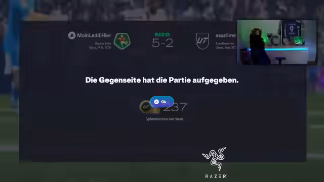 01:09:08Ein spezifisches Spiel gegen einen wiederkehrenden Gegner führt zu einer tiefgehenden Diskussion über Fair-Play im Online-Gaming. Nachdem der Streamer kurz den Controller weggelegt hat, um die Stream-Funktion zu starten, schickt sein Gegner ein Tor und löst damit eine Debatte über die sportliche Fairness aus. Der Gegner wird für einen 'gentleman's agreement' gelobt, der ein Tor schoss, als der Streamer führte. Der Streamer bewertet den Gegner als sehr fair und betont, wie er solche Momente schätzt, während er gleichzeitig seine eigene Unzufriedenheit mit den eigenen Spielzügen, insbesondere den erlittenen Anstößen, ausdrückt.