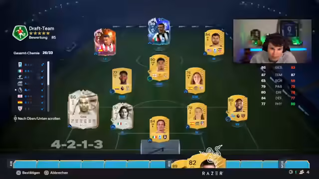 04:06:35Vor dem Start des Footdrafts wird die Partnerschaft mit dem Kicker-Manager-Spiel Interactive thematisiert. Die Zuschauer werden eingeladen, der Liga des Spielers beizutreten, um die gesamte Saison im Manager-Spiel gegeneinander anzutreten. Der Spieler gibt offen zu, dass seine eigene Performance in dieser Saison „katastrophal“ ist. Er zeigt sein Team, das er vor der Saison gekauft hat, und hebt hervor, dass es nur einen „Lichtblick“ gibt: Ragnar Aache, der langsam in Form kommt und 13 Punkte erzielt hat. Im Gegensatz dazu läuft es bei anderen Spielern wie Stöger und Hack von Borussia Mönchengladbach, sowie bei Augsburg und Kölnmö, überhaupt nicht gut. Patrick Schick, der als Star-Transfer für 5,5 Millionen geholt wurde, entpuppt sich als Flop, während Luis Diaz für nur 300.000 eine deutlich bessere Wahl gewesen wäre. Der Spieler ist in der Liga auf einem enttäuschenden 185. Platz von 218 Spielern und hofft auf die Wintertransferphase, um sein Team zu verbessern. Er ist offen für Tipps und betont, dass das Spiel kostenlos über den Browser oder die Kicker-App gespielt werden kann.