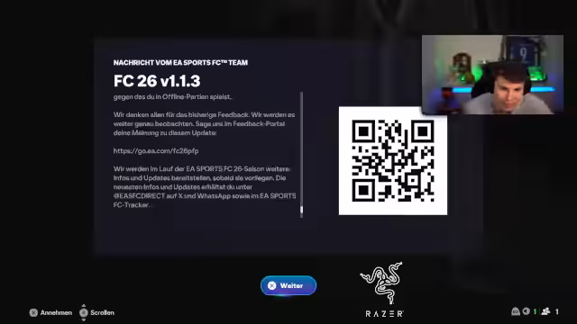 00:52:36Der Streamer entdeckt einen neuen Patch und scherzt darüber, wie er diesen für Content-Creator-Videos nutzen könnte. Er überlegt, Titel wie 'Neuer Patch verändert alles!' oder 'Neuer Patch: Game is dead!' zu verwenden, um die Zuschauer zu provozieren. Er plant, Videos zu erstellen, in denen er behauptet, dass sich das Spiel seit dem Patch ganz anders anfühlt, Pässe unmöglich geworden sind und die CPU-Verteidigung viel stärker ist. Er bedankt sich bei den Supportern Devil's Arrow und Weidi Bronco. Er überlegt, den Cup erneut zu spielen, um ihn fertigzustellen, und hofft auf einen Gegner, der schnell quittet. Er schlägt vor, Videos mit Titeln wie 'So gewinnst du jedes Spiel nach dem Patch' oder 'Der neue Patch hat alles verändert: Spieler bewegen sich nicht mehr, CPU fängt jeden Pass ab' zu erstellen, um die Zuschauer anzulocken. Er schlägt auch vor, den besten Spieler nach dem Patch vorzustellen, wie Claudia Pina, die den goldenen Flachschuss, Silber-Tiki-Taka, Silber-Dreieck und Silber-Finesse hat und gut mit anderen Spielern verlinkt ist.