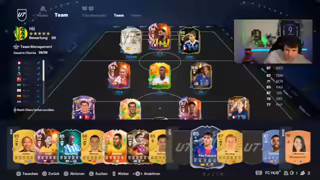 01:34:08Es wird ein Team zusammengestellt, wobei Kobasi aufgrund von Low Chem ausgeschlossen wird. Stattdessen wird Carlos Alberto in der Innenverteidigung in Betracht gezogen, trotz potenziell niedrigerer Dev-Werte, aber aufgrund seiner Playstyles. Die Kosten für Joro werden als zu hoch empfunden, und Saliba wird als Alternative genannt, obwohl er oft gesehen wird. Es wird beschlossen, Saliba ein Ultimate Scream Design zu geben, um ihn cooler aussehen zu lassen. Das Team wird für Rivals vorbereitet, mit dem Ziel, drei Siege in Folge zu erzielen, um in Division 1 aufzusteigen. Es wird betont, dass Karim Benzema sechs Tore für eine SBC benötigt. Der Streamer äußert seine Enttäuschung über die neuen Icon-Karten wie Pelé, da sie seiner Meinung nach zu schwach sind und einen Nachteil darstellen.