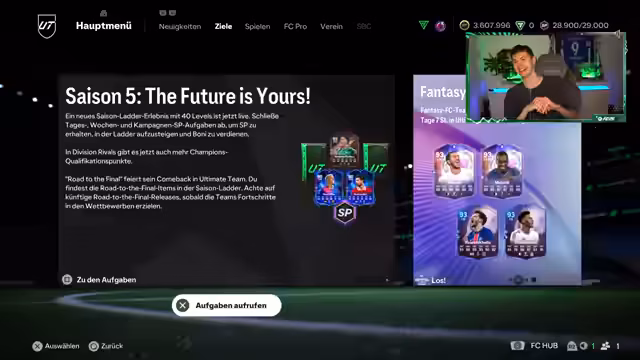 00:03:28Der Stream beginnt mit der Begrüßung des Publikums und der Mitteilung, dass heute viel im Programm steht. Der Streamer hat mit 994 Skillwert 14 Punkte für eine Tagesaufgabe zu holen und benötigt fünf Siege im Rivals-Modus. Zusätzlich kann er einen Cup spielen. Als Hauptziel wird das Erspielen von insgesamt 7000 Punkten durch die Kombination aus Rivals-Siegen, Cups und Tagesaufgaben genannt, um wichtige Evos zu vervollständigen.