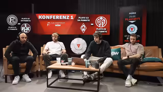 00:13:49Der Streamer erläutert das Champions-League-ähnliche Format der Playoffs und zeigt die Gesamttabelle auf. Dabei wird deutlich gemacht, dass Teams auf Platz 1 bis 8 direkt fürs Finale qualifiziert sind. Die verbleibenden Teams kämpfen in acht Paarungen, wobei das topgesetzte Team SC Freiburg auf den schlechtestplatzierten Gegner trifft. Die wichtigsten Partien werden vorgestellt, darunter Bochum gegen Köln und eine Konferenz mit Bremen gegen Mainz. Die Favoritenrolle wird diskutiert, wobei Bremen als klarer Favorit gegen das als unkonstant geltende Mainz gilt.