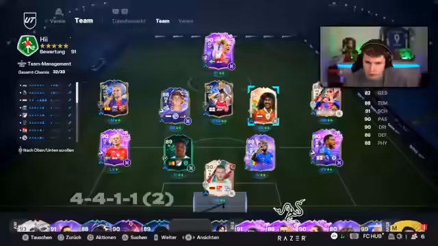 00:03:07Der Stream beginnt mit einem Check der Account-Situation, gefolgt von der Auswahl eines Teams für die FUT Birthday Party. Der Streamer hat ausreichend Voraussetzungen und unzählige 90+ Karten auf dem Account, fühlt sich aber wie ein Non-Grinder und bemängelt den abgeschwächten Markt durch die aktuelle Promo. Es wird entschieden, die Evos, wie Party im Zentrum und die Evo für Rodri, vorzubereiten. Rodri wird als RM mit Gold-Techniker und Finesse sowie Silber-Rakete aufgewertet, um eine solide Basis für den Rivals-Modus zu schaffen. Cavani und Merentiel werden ebenfalls erwähnt und Teil des späteren Teams.
