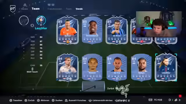 00:05:08Der Streamer beginnt mit dem Gameplay im Silbercup und diskutiert über die Teams, die er zusammenstellt. Er erwähnt die Schwierigkeiten, bestimmte Spieler wie Kolomoani und Ted im Silbercup zu verwenden, und stellt ein Team mit drei Franzosen, einem MLS-Spieler und einem Spurs-Spieler zusammen. Er tauscht auch Evolutionskarten ein, um das Team zu verbessern, und erwartet ein hohes Niveau im Spiel.