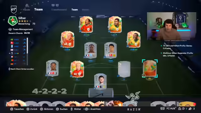 00:11:45Der Streamer prognostiziert, dass der Season Pass in der nächsten Woche deutlich besser wird, da EA die Spieler jetzt mit guten Inhalten locken muss, nachdem die Vorbesteller-Points aufgebraucht sind. Er ist Level 20 im Season Pass, hat aber nicht den Premium Pass gekauft. Anschließend konzentriert sich der Streamer auf die Zusammenstellung seines Teams für den Silbercup, um die Aufgaben für Hugo Lloris zu erfüllen. Er benötigt unter anderem einen Tottenham-Spieler aus der Premier League und mehrere französische Spieler. Es werden verschiedene Silberkarten wie Tarkai, Cobb, Ahamada und Melillier in Betracht gezogen und das Team entsprechend angepasst. Dabei wird auch über die Effektivität von Spielern wie Carlos Alberto diskutiert, der als absoluter 'Goat' im Silbercup bezeichnet wird.