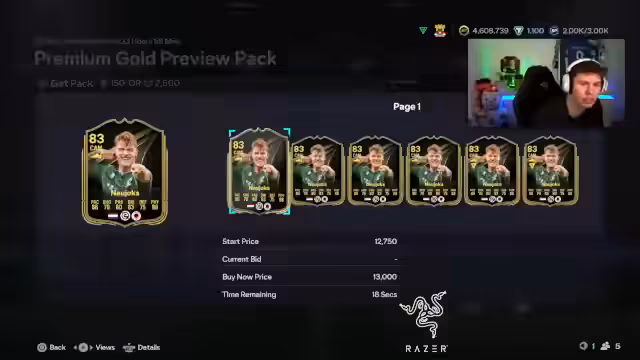 00:03:35Der Stream beginnt mit dem Start ins Black Friday Event und der Weekend League. Es wird erwähnt, dass ein neues Team aufgebaut werden muss und das Budget knapp ist. Die Pack-Öffnungen verlaufen zunächst enttäuschend, mit vielen Informs und nur wenigen Karten über 84. Der Streamer sucht einen Mitspieler für die WL, der über eine Million Coins und genug Förderpunkte für das 91er-Icon-Pack verfügt.