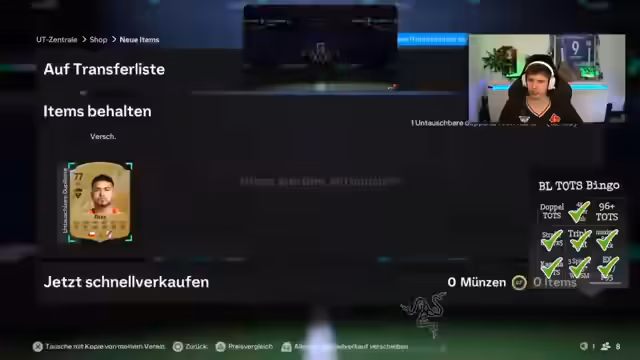01:21:44Für Aufsehen sorgt ein großes Gewinnspiel im Stream. EA Sports spendiert eine Bundesliga-TOTS-Karte, die unter allen Teilnehmern verlost wird. Die Teilnahme ist einfach, indem man den Kartennamen in den Chat schreibt. Die Auslosung soll kurz nach 19 Uhr stattfinden. Der Streamer kommentiert die Live-Ziehung und die Teilnahmezahlen und reagiert auf die ersten gezogenen Karten.