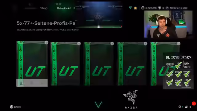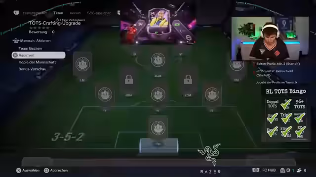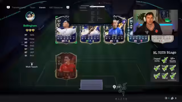 03:14:22Der Streamer ändert seine Taktik und zieht nun ausschließlich Premium-Karten, in der Annahme, dass TOTS-Karten eher in Bundesliga-Packs zu finden sind. Er bereitet seine Zuschauer auf eine große Verlosung vor: eine Bundesliga Team of the Season-Karte für Frauen oder Männer. Um teilzunehmen, müssen die Zuschauer seinem Kanal folgen und 'Totskarte' in den Chat schreiben. Die Verlosung soll in etwa einer Stunde stattfinden und kurz nach 19 Uhr beendet sein.