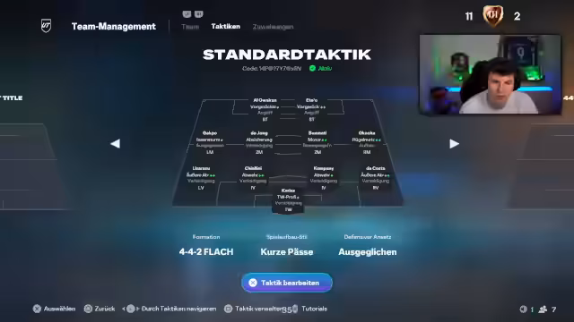 00:00:08Zu Beginn des Streams wird das Ziel klar definiert: die 15 Siege in der Weekend League zu jagen, um die Belohnung von 1+ Millionen Coins zu sichern. Das Team wird detailliert vorgestellt, wobei Al-Uwe als wichtigster Neuzugang in die Startelf zurückgeholt wurde. Spieler wie Chagpo und Maino werden diskutiert, während die Taktik auf eine 4-4-1-1 Formation mit Schattensturm festgelegt wird. Die Absicht ist, an die Erfolge der Vergangenheit anzuknüpfen und das gesamte Potenzial des Kaders auszuschöpfen.