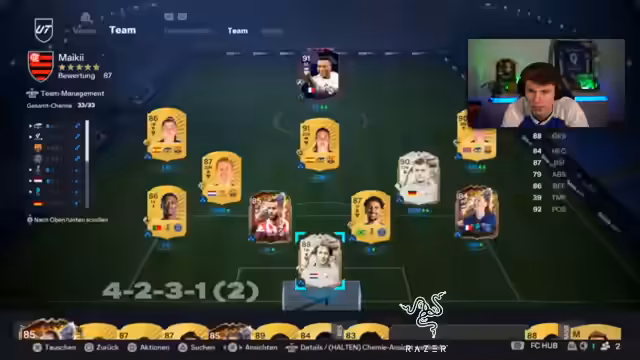 02:37:31In der Elite Division sammelt der Streamer nun doppelte Wochenboni und kassiert zusätzliche Punkte für Siege. Die Teambewertung wird neu durchgeführt und ist "tradable". Die Diskussionen konzentrieren sich auf den Kauf neuer Spieler wie "Bonmarti" und den Verkauf von Spielern wie "Gattuso", um das Budget zu optimieren. Es wird über die Stärken verschied_positionen wie Zentrale Mittelfeld und Abwehr debattiert, um die Defensivschwächen zu beheben und eine bessere Chemie im Team zu schaffen.