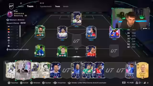 00:04:00Nachdem am Wochenende der DFB-E-Pokal begleitet wurde, steht nun der Weekend League Grind an. Es stehen 3,3 Millionen Coins zur Verfügung, um den Cup zu spielen und ein neues Team zu bauen. Die Überlegung ist, ob Bon Marti gekauft werden soll, um sie zu testen, da die Karte vielversprechend aussieht. Alternativ wird erwogen, Armin Younes durch eine Evo aufzuwerten, was jedoch eine andere Formation erfordern würde. Der Plan sieht vor, Younes mit Tiki Taka, Just Like Jamie und einem Schießen Boost zu versehen, um eine starke Karte zu erhalten. Die resultierende Karte soll dann auf der LM-Position in einer 4-1-4-1 Formation eingesetzt werden, eventuell in Kombination mit Bonmarti. Es gibt jedoch Schwierigkeiten, die Chemie im Team aufrechtzuerhalten, insbesondere aufgrund fehlender Icons und der Notwendigkeit, bestimmte Spieler wie Hatto und Möcke einzusetzen. Verschiedene Optionen werden geprüft, darunter der Einsatz von Spielern wie Van der Sar, Schweinsteiger und Premier League Rechtsverteidigern, um die Chemie zu optimieren. Der Preis von Bonmati wird beobachtet, um ein gutes Angebot zu finden, während gleichzeitig nach Alternativen wie dem Leveln von Armin Younes gesucht wird. Die Integration von Schalkern ins Team wird thematisiert, und es wird überlegt, welche Rollen und Playstyles den jeweiligen Spielern am besten passen.