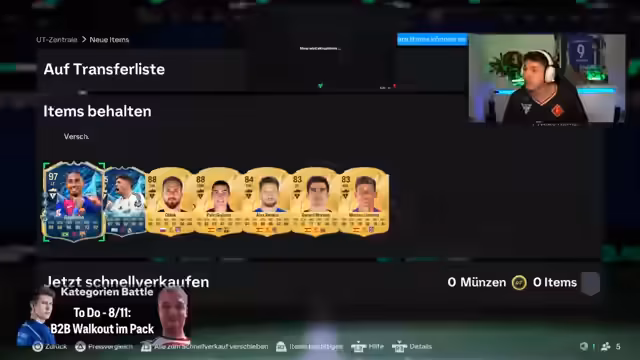 01:16:28Das Pack Battle beginnt mit der Bearbeitung verschiedener Kategorien, die nacheinander abgearbeitet werden müssen. Jeder Streamer arbeitet seine eigenen Kategorien parallel ab, wobei eine Kategorie fünfmal dieselbe Pose im Pack erfordert. Ein zusätzlicher Punkt gibt es für eine Top 4-Karte mit einer Bewertung von 97, außer Bellingham. Die Schwierigkeit der Aufgaben wird von den Teilnehmern als höher als erwartet beschrieben, und es kommt technisch bedingt zu einem leichten Problem, das behoben werden muss.