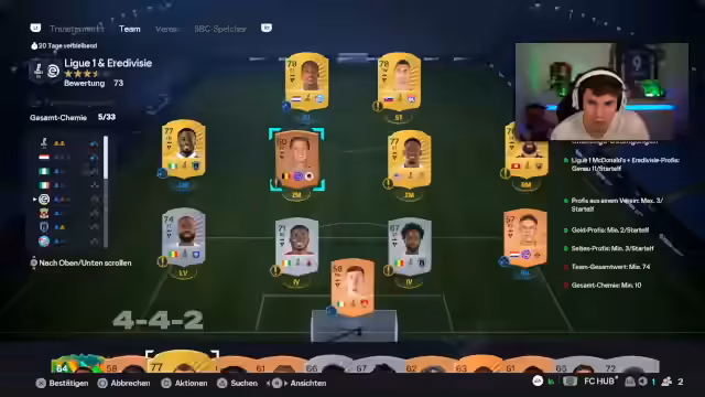 05:40:05Der Streamer baut ein neues Footdraft-Team und diskutiert verschiedene Formationen wie 4-2-4 und 4-3-2-1. Er bewertet Spieler wie Torres, Osiman und James, deren Qualität und Playstyles, und entscheidet sich für eine offensive Aufstellung. Dabei geht es um die Verfügbarkeit von SBC-Karten, die Meta-Relevanz bestimmter Cards und wie man mit einem kreativen Aufbau im Footdraft-Modus erfolgreicher sein kann. Besonders hervorgehoben werden Star Players wie Eto'o und James.