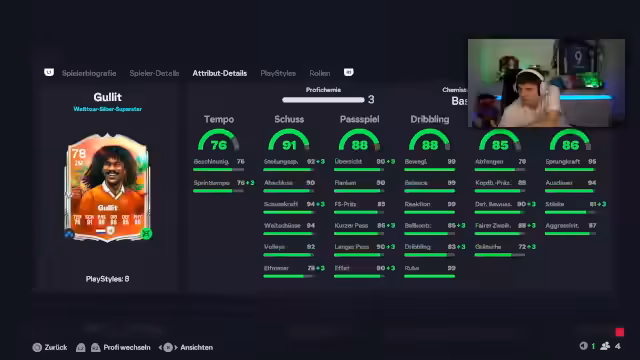 00:21:08Nach einigen Spielen ist Gullit fast fertig: Es fehlen nur noch wenige Evos wie Stay Frosty, die zusätzliche Dribbling-Werte geben. Der Streamer berechnet, dass Gullit bald 88 Pace durch zukünftige Evos erreichen wird. Er diskutiert Playstyle-Optionen wie Finesse und Tiki-Taka und betont, dass jeder Spieler individuelle Entscheidungen treffen muss. Gleichzeitig plant er, neue Evos für andere Spieler wie Lena Oberdorf oder Emre Can zu starten.