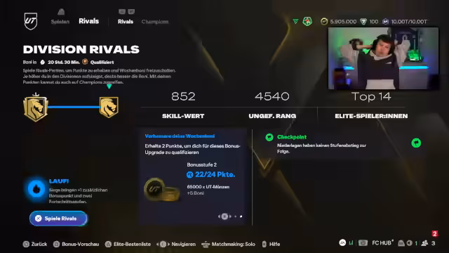 00:09:04Nachdem er gestern fleißig war und die Dailys gespielt hat, berichtet der Streamer von seinen Pläne für den Stream. Er hat bereits den Europa Cup fertiggespielt und möchte nun Rivals spielen und eventuell den Südamerika Cup bestreiten. Der Fokus liegt auf seiner Jule Brand Evo, die er als sehr stark beschreibt, aufgrund ihrer physischen Attribute, Schnelligkeit und Länge. Er identifiziert diese Spielertypen als die besten im aktuellen Spiel und vergleicht sie mit anderen langamen, schnellen Spielern wie Schelin und Pfeiffer.