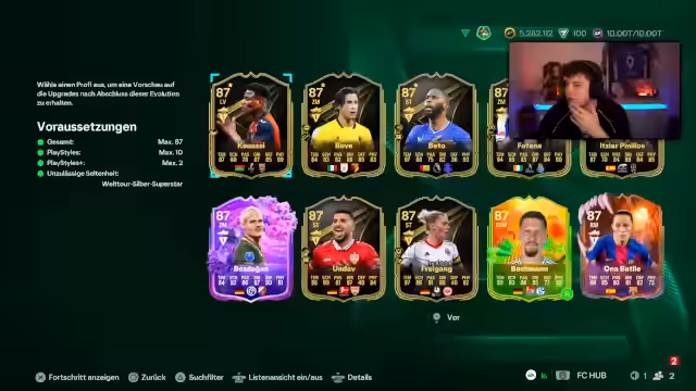 05:42:13Nach dem emotionalen Höhepunkt der Streamer-Session wird das Fokus auf das Team-Building verlagert. Der Streamer betrachtst die gezogenen "Road to the Final"-Karten, wie Stabfeld und Rodriguez, und überlegt, welche Spieler er behalten oder auf dem Markt verkaufen kann. Er diskutiert mit dem Chat über potentielle SBCs (Squad Building Challenges), insbesondere eine mögliche Paris-Card. Ein weiteres wichtiges Thema ist der Wunsch, Spieler wie Usman oder Rashford durch eine "Über den Wolken"-Evolution aufzuwerten, um deren Werte zu verbessern und sie besser in seine auf Kreativität ausgelegte Spielphilosophie zu integrieren.