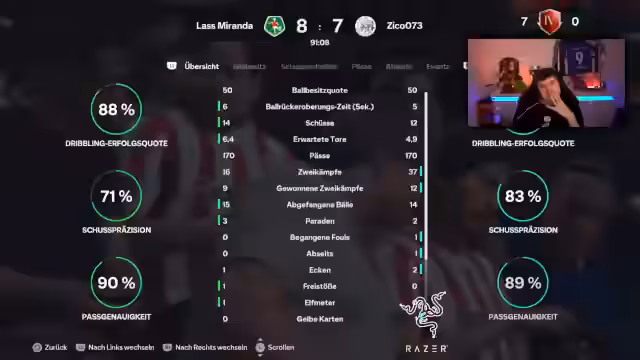 04:33:06Der Stream konzentriert sich intensiv auf die Jagd nach dem 15. Sieg im Road-to-the-Final-Event. Trotz einer hohen Führung kämpft der Streamer mit einer unzuverlässigen Defensive, insbesondere mit den Spielern Eihahn und Schallenberg, die in vielen Zweikämpfen versagen. Die entscheidende Phase ist geprägt von einem katastrophalen Einbruch, bei dem der Gegner durch einfache und oft fehlerhafte Taktiken wie wiederholtes Drücken des Kreisknopfes und zahlreiche Fehltacklings (92 Zweikämpfe) zum Ausgleich und sogar zum Sieg (9-6) gelangt. Der Streamer ist sprachlos und fassungslos über diese vermeintlich verdiente Niederlage, die trotz seiner Führung bei 12-0 erreicht wird.