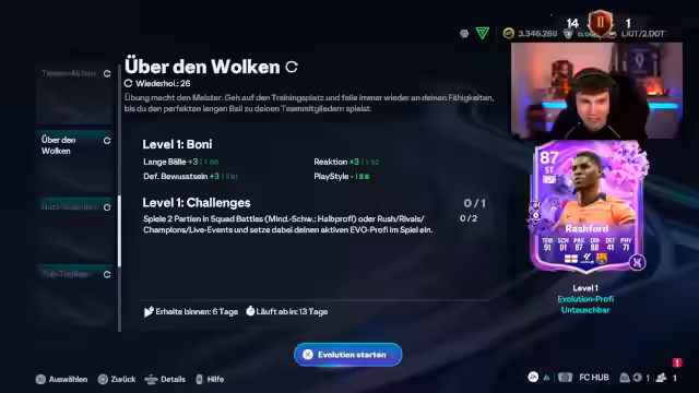 01:33:28Der Fokus liegt auf dem Fortschritt der Evolutions-Aufgaben im Spiel, insbesondere für die Spieler Karim Benzema und Leuchter. Es geht um die spezifischen Statistik-Ziele, die der Streamer erreichen muss, wie 'über den Wolken' für Leuchter und 'langer Pass' für Karim. Der Streamer beschreibt den Aufwand, den er betreibt, und den Stress, der entsteht, wenn er denkt, eine Woche der Aufgaben verpasst zu haben, und wie er versucht, dies mit 'cleveren Tricks' wie dem Ausblenden der Evolution im Labor zu umgehen.