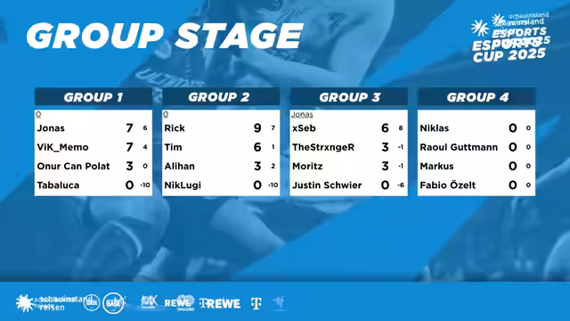 05:18:24Es wird die Gruppenübersicht gezeigt, Niklas hat ein Minus von 12 Toren. Fabio hat die vermeintlich leichteste Ausgangssituation. Es folgt das letzte Gruppenspiel, danach die Knockouts. Alle Viertelfinalpartien werden im Stream gezeigt. Es wird auf den Hauptpreis des Schauinsland Reisen E-Sports Cup 2025 hingewiesen: ein Hotelgutschein für die türkische Riviera. Leverkusen spielt gegen Markus in dunklen Trikots, Raul in weißen. Markus erzielt das 1:0. Raul steht unter Druck, muss das Spiel gewinnen, um weiterzukommen. Es wird auf das Spiel von Niklas geschaltet. Die Viertelfinalpartien starten in ca. 20-25 Minuten. Raul erzielt den Ausgleich und es wird zu Fabio gegen Niklas geschaltet. Niklas steht 0-0. Es wird auf das Gewinnspiel hingewiesen: Urlaub in den Chat schreiben. Niklas liegt 1-0 hinten. Fabio tritt für das österreichische Bundesheer an. Niklas kassiert das 0:2.