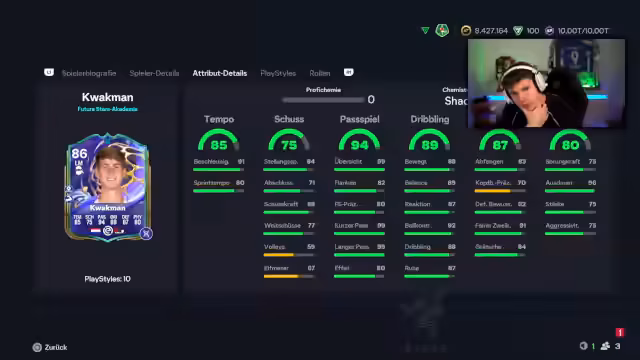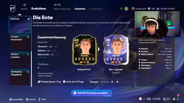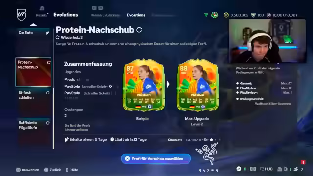01:10:19Der Streamer konzentriert sich auf die Verbesserung eines Spielers im Modus 'Evolution'. Nachdem er dem Spieler bereits 90 Volleys verliehen hat, diskutiert er die möglichen Ergänzungen 'Right Back' oder 'Left Back'. Weitere Überlegungen umfassen die Vergabe von 'Physis', wobei er die Statten 'Schießen' und 'AV' final beibehält, da diese für seine Spielstrategie wertvoller sind. Er prüft auch das Hinzufügen von Weakfoot und Skillmoves, um den Spieler für 'SBCs' (Squad Building Challenges) fit zu machen.