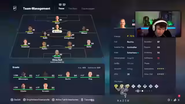 02:30:13Der Stream beginnt mit persönlichen Anekdoten, bevor sich der Fokus auf die Analyse von Spielkarten und Teamzusammenstellungen in FIFA richtet. Insbesondere wird die Stärke eines bestimmten Spielers, Knauf, hervorgehoben und als eine der wenigen Karten, die unbedingt im Team sein sollten, bezeichnet. Es werden auch alternative Spielmoden wie Rivals und Ultimatives angesprochen, wobei sich der Sprecher für Rivals entscheidet, um weitere Spiele absolvieren zu können. Die Teamchemie wird als ein zentrales Problem bei der Erstellung einer starken Formation identifiziert, wobei bestimmte Spieler als problematisch angesehen werden.