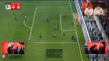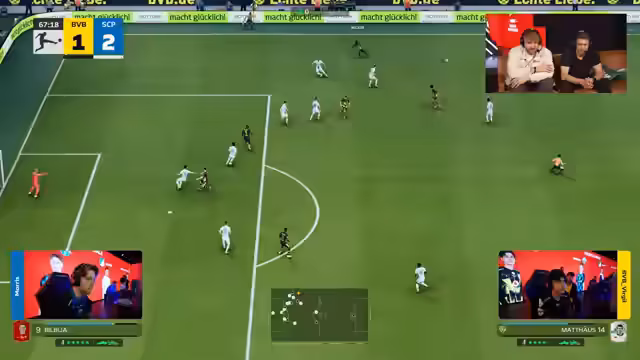 01:51:01Das erste Spiel zwischen der TSG Hoffenheim und Borussia Mönchengladbach beginnt. Gladbach dominiert das early game und hat mehrere hundertprozentige Torchancen. Der TSG-Torwart Ayman reagiert jedoch glänzend und pariert mehrere Male stark. Trotzdem schafft es Hoffenheim in der letzten Sekunde der ersten Halbzeit durch Ayman in Führung zu gehen. Die Stimmung bei den Gladbachern ist frustriert.