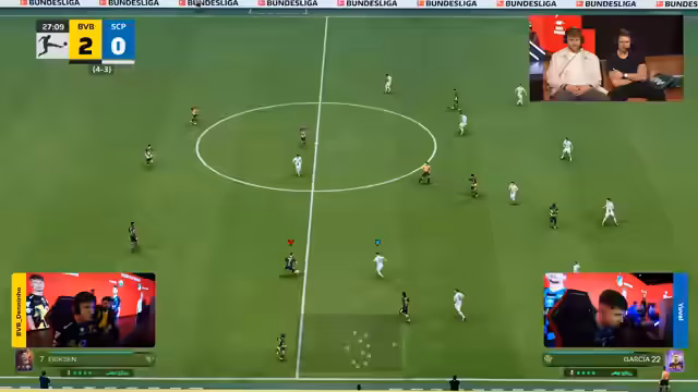 04:29:08Zur Halbzeit führt Borussia Dortmund mit 3:1. Die Kommentatoren erklären kurz den Ultimate-Team-Modus, der im Spiel verwendet wird. In der zweiten Halbzeit setzt Dortmund seine Dominanz fort. Gladbach, repräsentiert von Lukas, zeigt zwar Bemühungen, kann aber kaum Torchancen erzeugen. Dortmund kontert eiskalt aus und baut den Vorsprung kontinuierlich aus. Nach dem Tor zum 4:1 und später zum 5:1 scheint das Spiel entschieden zu sein.