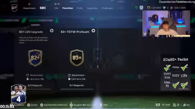 00:24:10Während des Pack Battles vergleichen die Streamer ihren Pack-Luck. Während Paxi bereits mehrere Team of the Year-Inhalte gezogen hat, hat der Streamer seit mehreren Tagen nur einen Martinez ziehen können und äußert sich darüber frustriert. Sie diskutieren über ihre bisherigen Ergebnisse, die hohen Kosten für certain Informs im Transfermarkt und die Statistik, wie viele Packed man durchschnittlich öffnen muss, um einen Totti zu ziehen.