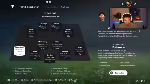 00:25:38Nachdem die Teams zusammengestellt sind, konzentriert sich der Streamer auf die taktische Ausrichtung der neuen 4-2-2-2 Formation. Er entscheidet sich für das Spiel mit "Motor"-Anweisung für die Mittelfeldspieler, um sie defensiv zu stabilisieren, während der Sechser mit "Bewegungsfreiheit" agieren soll, um offensiv Räume zu finden. Es werden verschiedene Spielerpositionen getauscht, wie z. B. Georges und Streak, um die Chemie zu optimieren. Auch die Trikot- und Ballwahl wird als Teil des Tests betrachtet, um den visuellen Look des Teams zu verbessern und einheitlich zu gestalten.